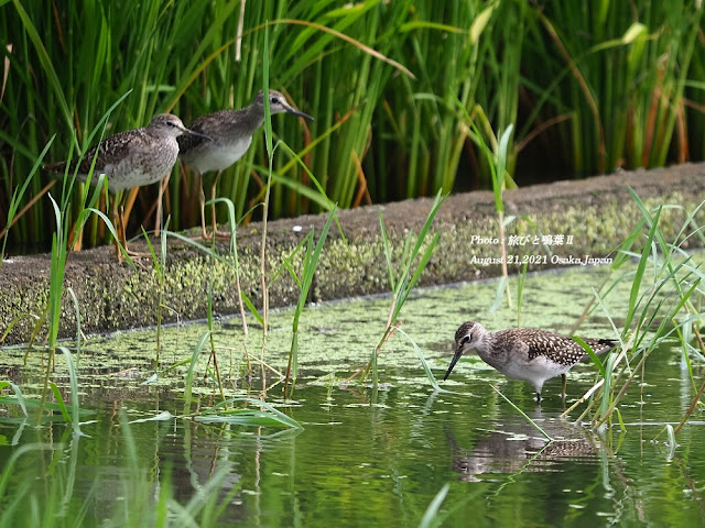休耕田に「ピッピッピッ」とよく通る声で2羽のシギが降りた。初めの場所はとても見にくい田で、草向こうに1羽だけを見つけたがもう1羽がいない。そのうち姿が見えなかったもう1羽が直ぐ近くの草むらにいたのを気づかずにいたので、そのシギに見つけられて大きな声で鳴きながら飛び、近くの休耕田に降りたのを確認した。ところが、そこでは3羽になっている。1羽は別種かとよく見るが同じタカブシギ。3羽が家族なのか、前日1羽でいたものと2羽がたまたま合流したのかは不明。