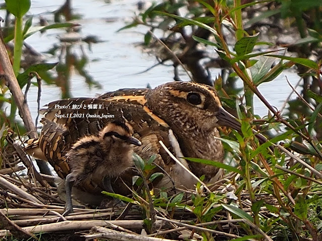 山階鳥類研究所によれば、タマシギの抱卵期間は16~18日とのこと。24日から計算するとぼちぼち孵化してもおかしくない。そんなわけで今朝見にいくとまだ抱卵中。その後、左岸河川敷にコサメビタキに会いに行き、昼過ぎふたたび巣に立ち寄ると、雛が孵っていた。しばらく観察するとどうも2羽いる。その後、2羽は孵化していることを確認。途中抱卵中のオスが腰を上げて卵の殻を巣の外へ捨てた。ひょっとしたら腹の下で殻から出たばかりの雛がいるのかも知れない。