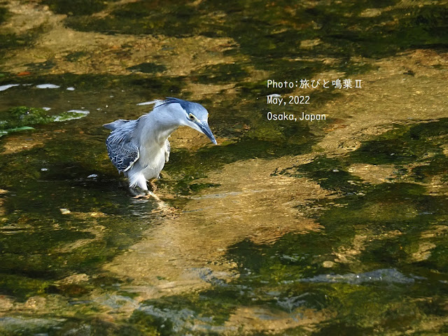 山へいってサンコウチョウの声を聞きながら、キビタキの水浴びを撮っていたら、地元の人が通りかかり「先日、この先で熊が目撃されているので十分注意してください」と教えてくれた。数年前は地元の山でも熊の徘徊があった。そのまま、バイクを置いている場所まで下り、暑いが河川敷へ移動した。チョウゲンボウはまだ巣立っていない様だった。マガモの親子がいたが、ヒナは10羽から8羽に減っていた。帰る前にもう一度川を確かめるといつのまにかササゴイが1羽来ていた。淡水魚のおいかわ(追河)はまだ上がってきていないと思い込んでいたが、目の前でササゴイが見事に婚姻色のオスのおいかわを捕まえたのには驚いた。今期初の目撃だった。
